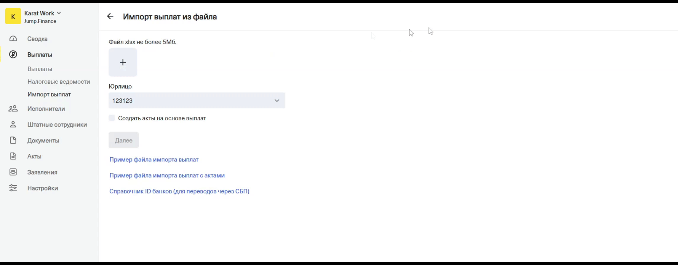 Войдите в раздел “Выплаты” → "Импорт выплат" и нажать + в правой части экрана.