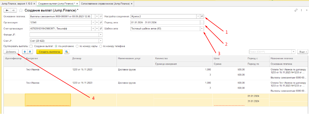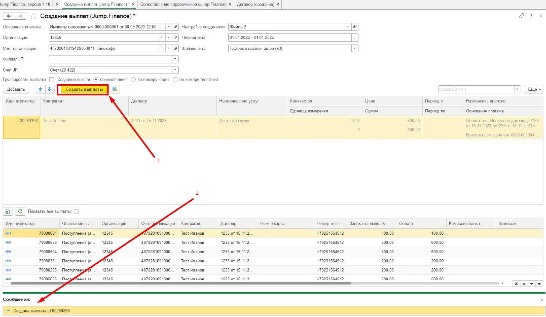 3. Чтобы создать выплату необходимо нажать на “Создать выплаты” (1) и получаем ответ от 1С, что выплата создана (2).