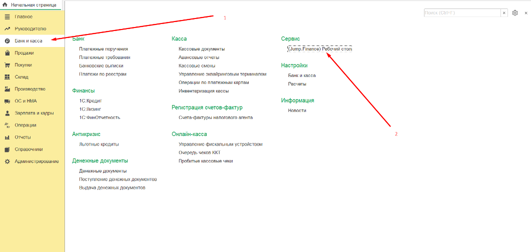 1. Для этого переходим в раздел “Банк и Касса” - “Рабочий стол”