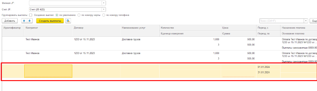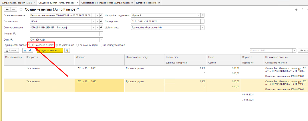 Обращаем внимание, если объединить все выплаты, то назначение платежа в выплате пишется по всем созданным выплатам в 1С.
