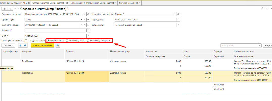 Функция "группировать выплату" объединит все выплаты по одному контрагенту и выплата поступит одной суммой исполнителю на реквизиты "по умолчанию" или "номеру карты" или "по номеру телефона". Соответственно реквизиты в объединяемых выплатах должны совпадать.