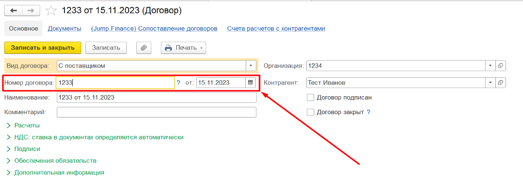 Поле договор обязательно для заполнения, необходимо обязательно указывать номер договора и его дату.
