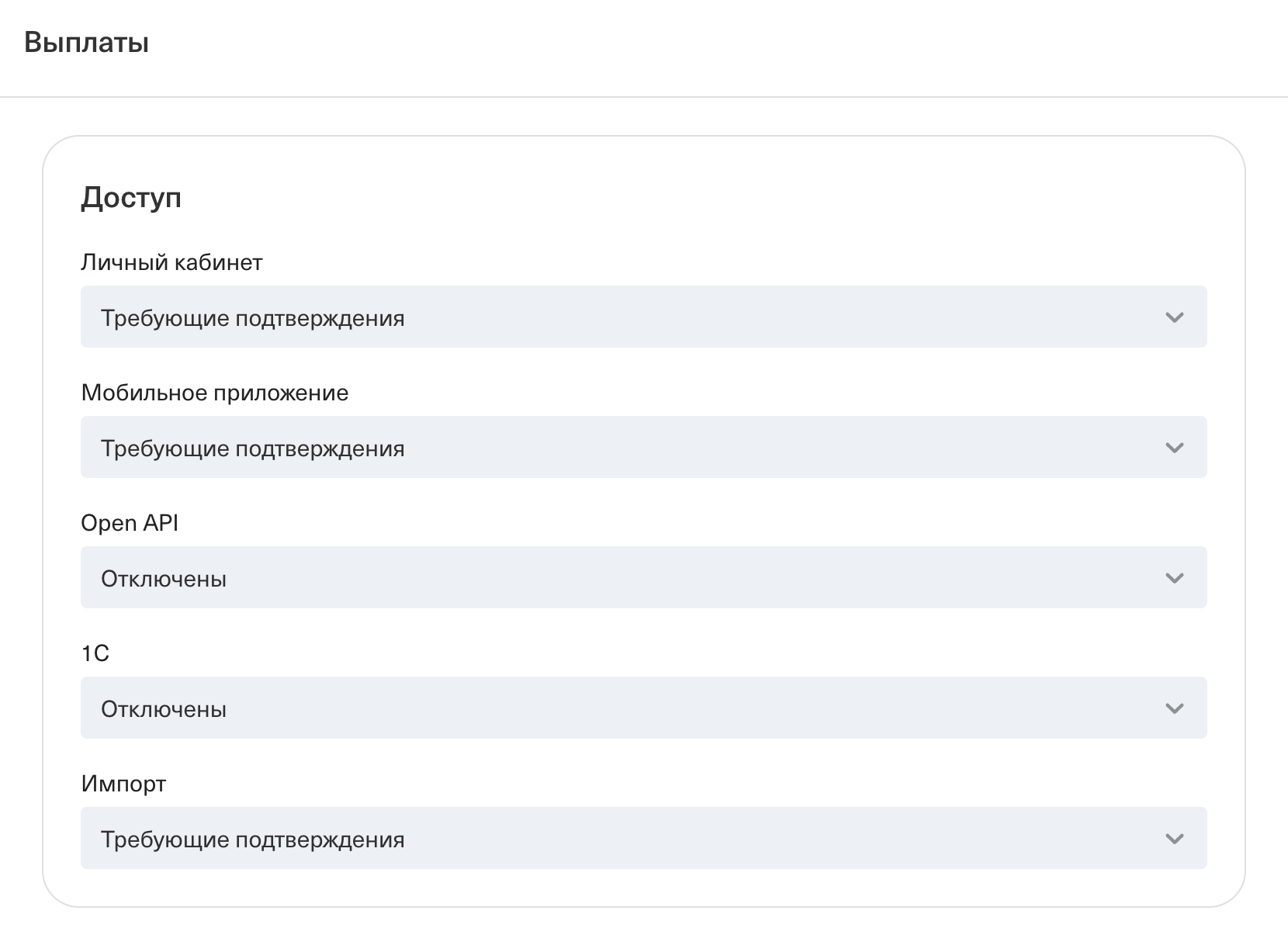 Требующие подтверждения — выплата сначала попадёт на подтверждение пользователю, у которого есть права для подтверждения выплат. Выплата уйдёт в обработку, только когда пользователь её подтвердит;