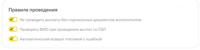 Проверять ФИО при проведении выплат по СБП — при установке данного правила, при отправке выплат через систему быстрых платежей (по номеру телефона), система будет сверять ФИО исполнителя с ФИО держателя карты по указанному номеру телефона. Если данные не будут совпадать, выплата попадет в ошибку.