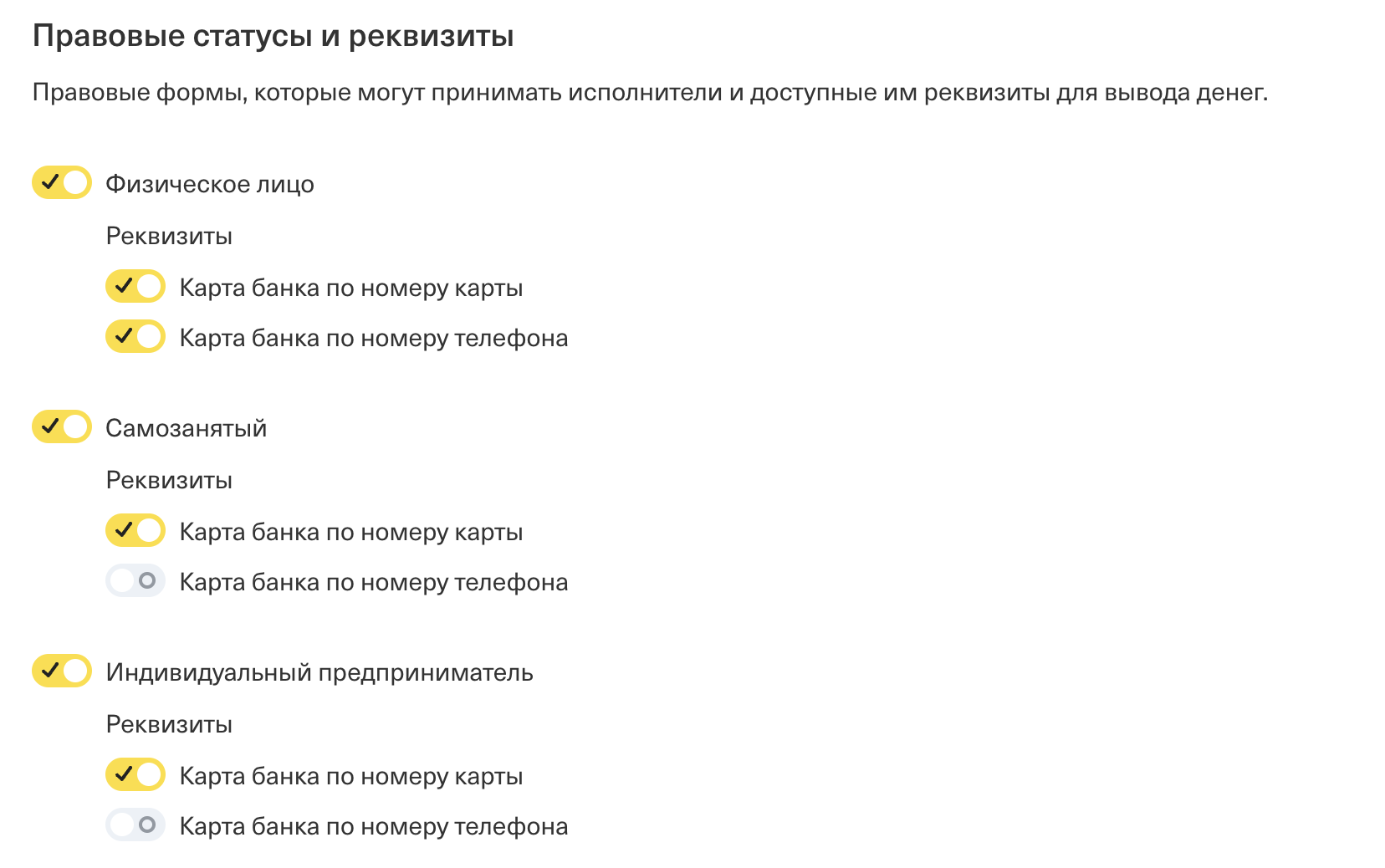В данном разделе вы можете указать какие правовые статусы могут принимать исполнители, а также на какие типы реквизитов возможен вывод средств.