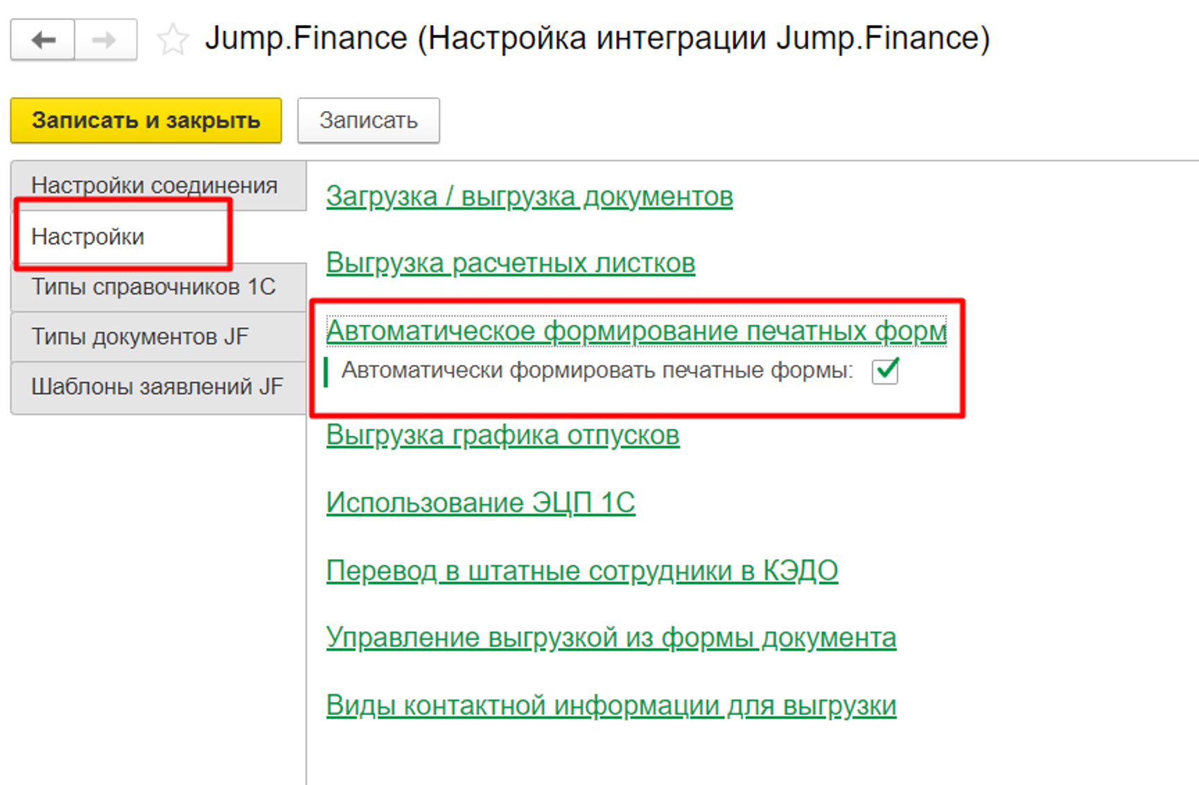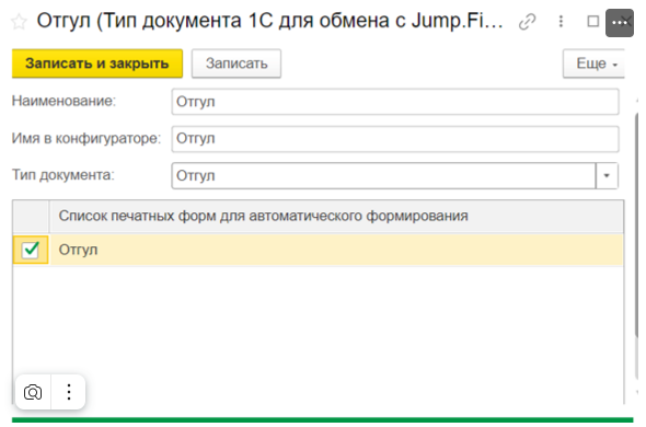 После этого дважды нажмите на тип документа, и в открывшемся окне поставьте галку на печатной форме, далее сохраняете изменения через кнопку “Записать и закрыть".