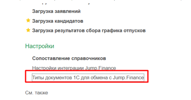 Далее переходите в модуль, открываете "Типы документов 1С для обмена с Jump Finance"