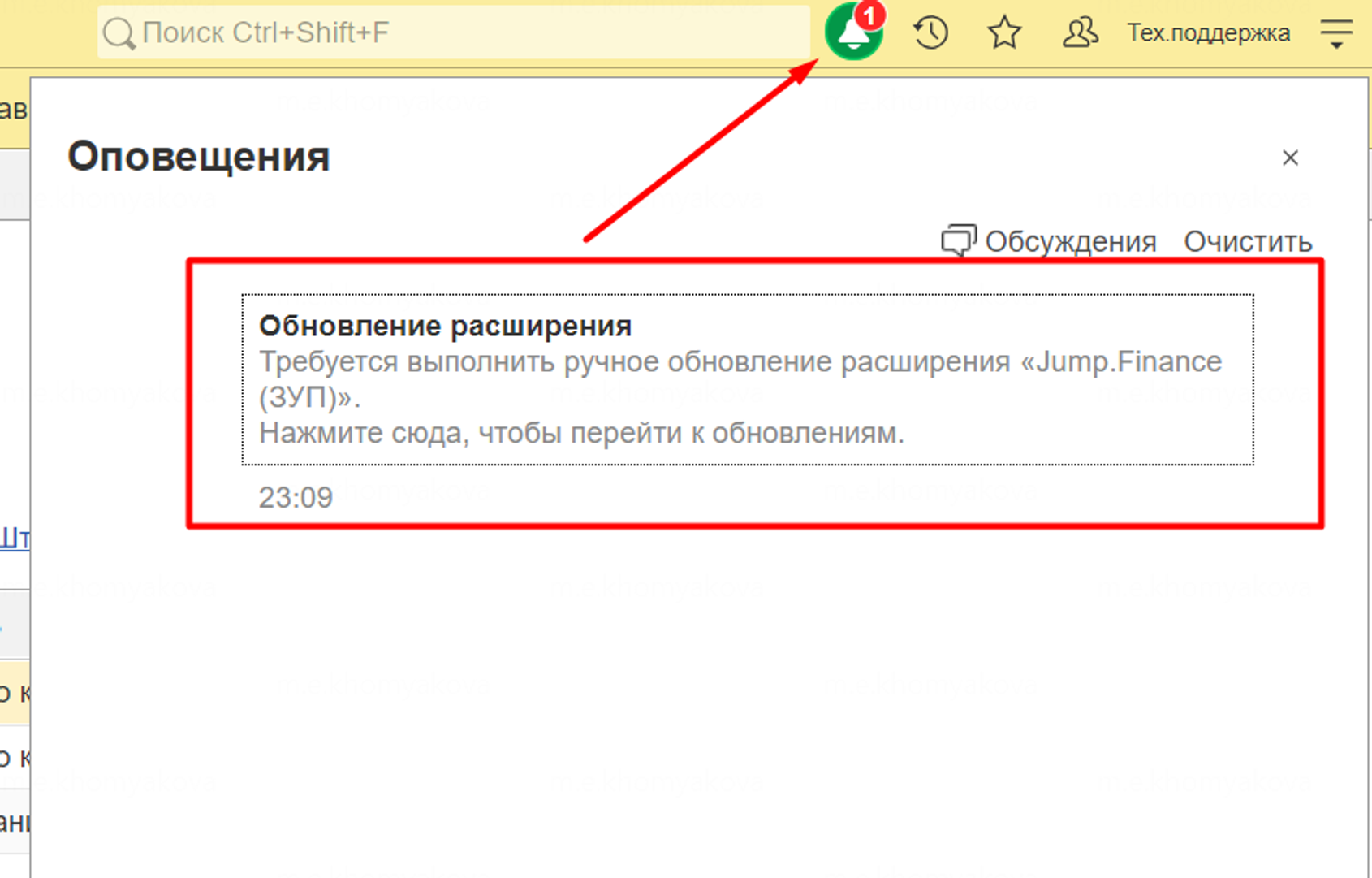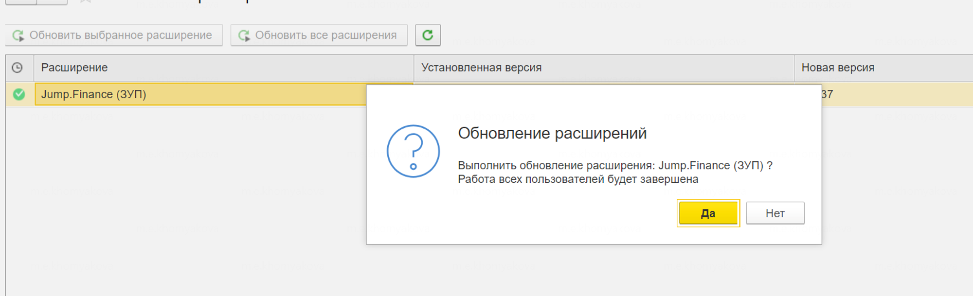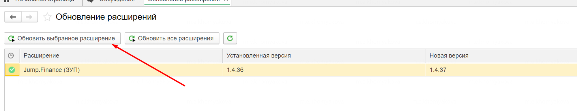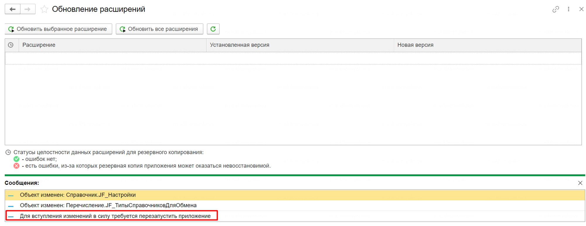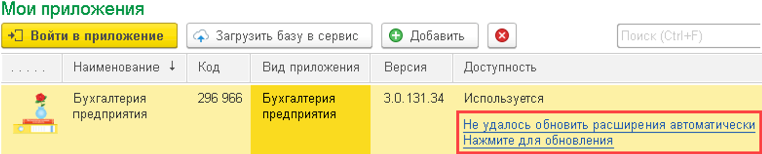 Также в личном кабинете пользователя, в колонке “Доступность” списка “Мои приложения”, для приложений, в которых не удалось обновить расширения, выводится гиперссылка “Не удалось обновить расширения автоматически. Нажмите для обновления” При нажатии на гиперссылку происходит переход в приложение и открытие формы обновления расширений.