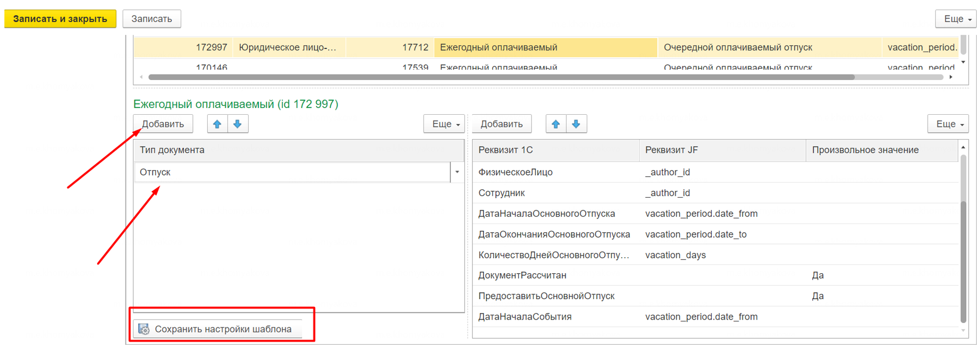 В верхней табличке отображаются шаблоны заявлений из личного кабинета JF, в нижней табличке (слева) отображаются документы, которые могут быть созданы на основании заявления. В табличке справа отображается сопоставление используемых полей в заявлении JF с полями в создаваемом на основании заявления документе в 1С. Для добавления возможности создания документа на основании заявления из JF, выбираем нужный шаблон в верхней табличке, в нижней левой табличке нажимаем кнопку “Добавить”.