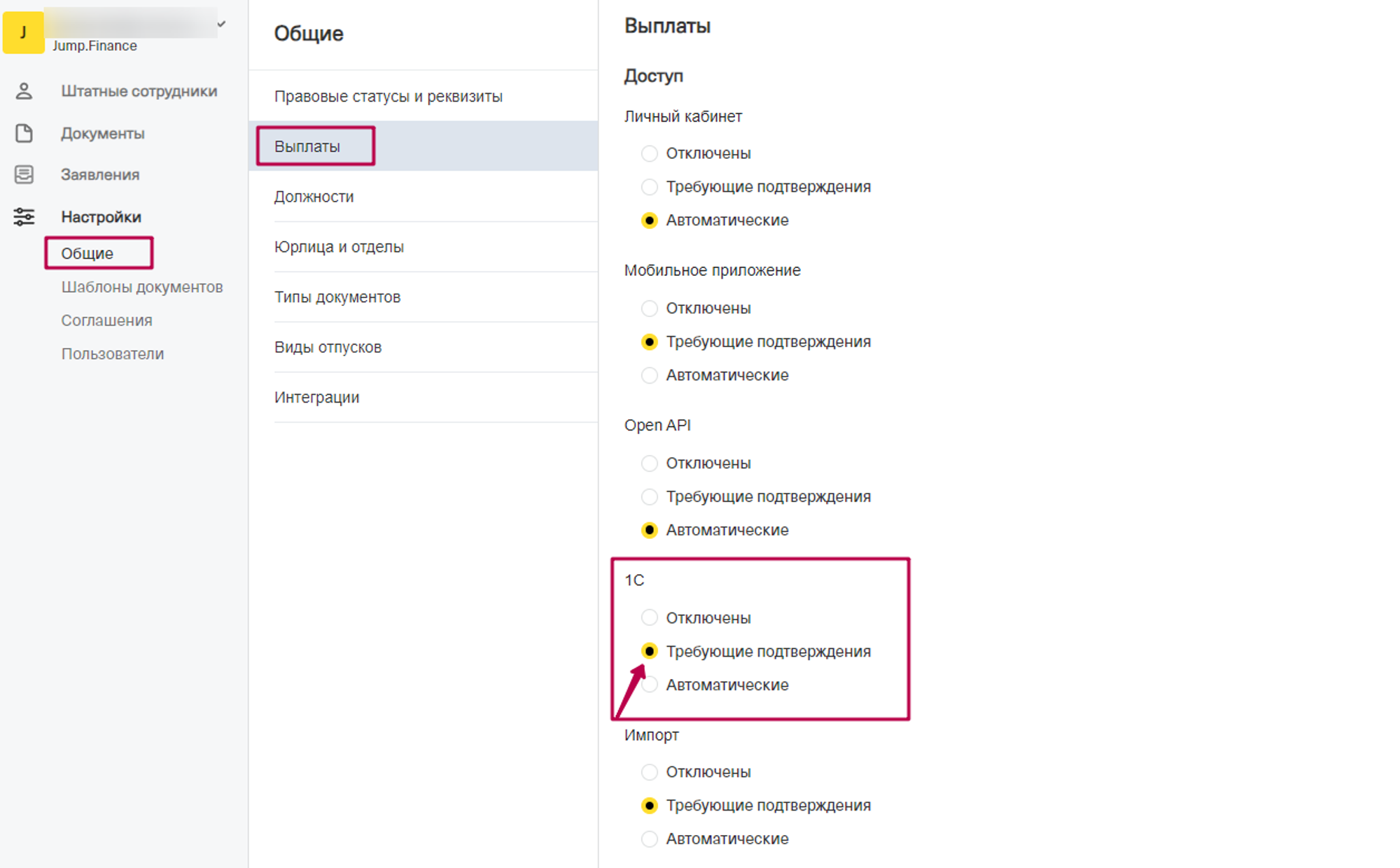 Перейти в личный кабинет компании, во вкладку “Настройки-Общее-Выплаты”, указать в блоке 1С выгрузку “Автоматически” или “Требующие подтверждения”.