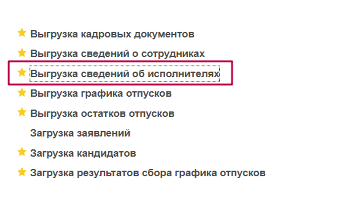 Далее в 1C перейдите во вкладку "Выгрузка сведений об исполнителях"