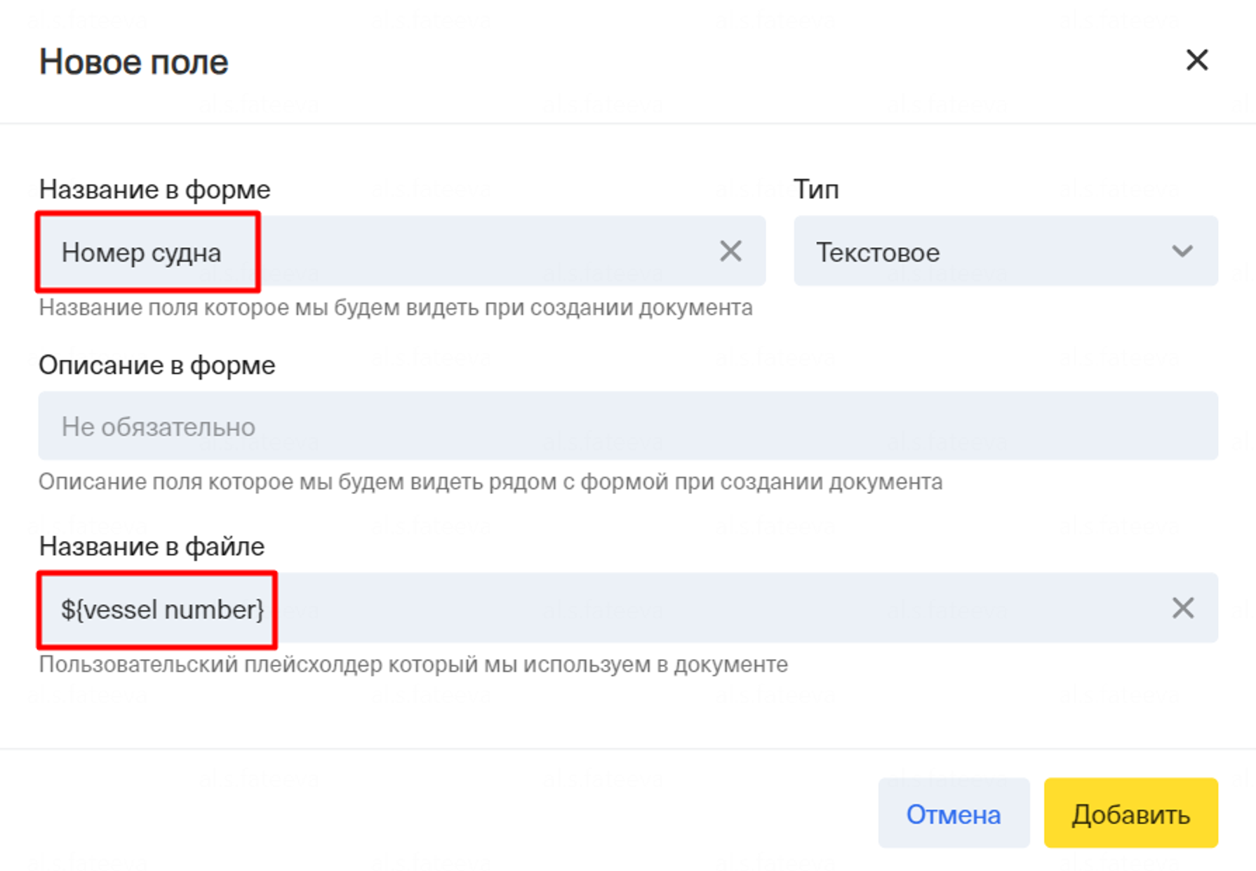 Также вы можете создать свои собственные пользовательские плейсхолдеры, добавив их через функцию “Поля в документе/Добавить”.