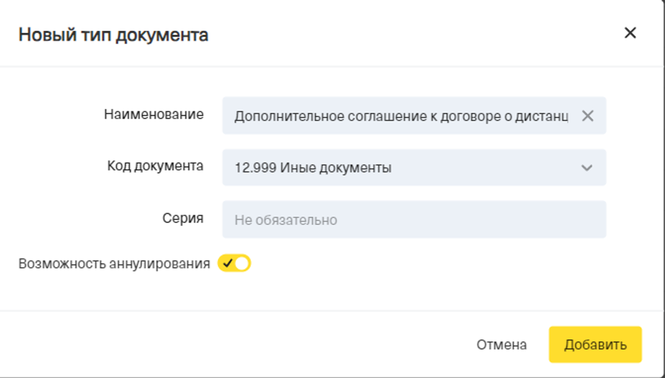 Далее введите название, укажите код и при необходимости отмечайте возможность аннулирования.