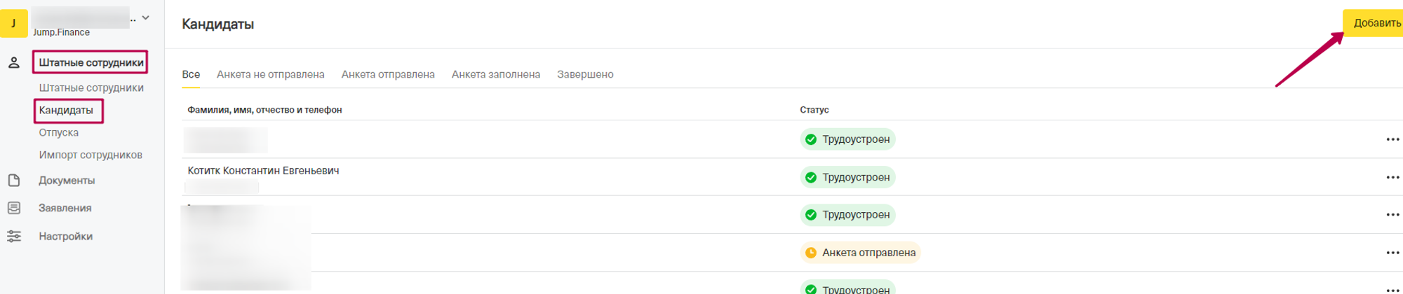 Чтобы принять нового сотрудника/кандидата на должность, нажмите кнопку “Добавить” в правом верхнем углу страницы “Штатные сотрудники/Кандидаты”.