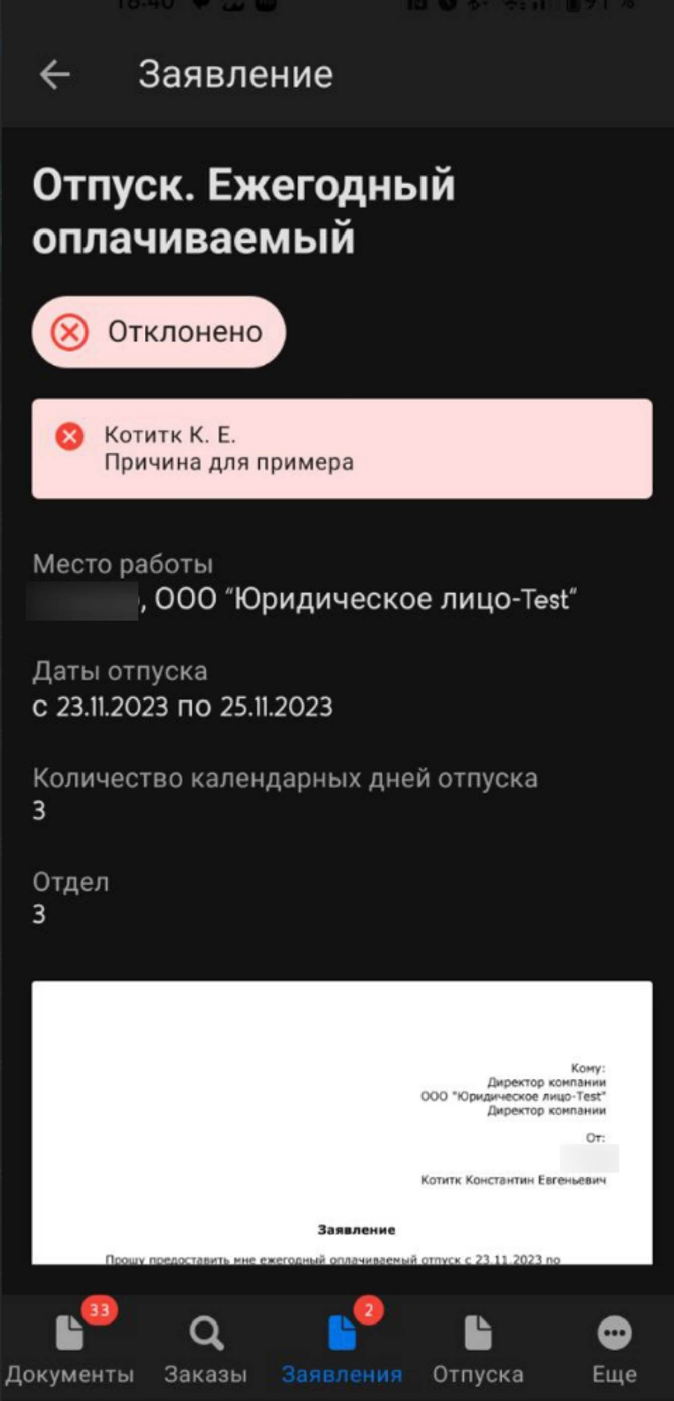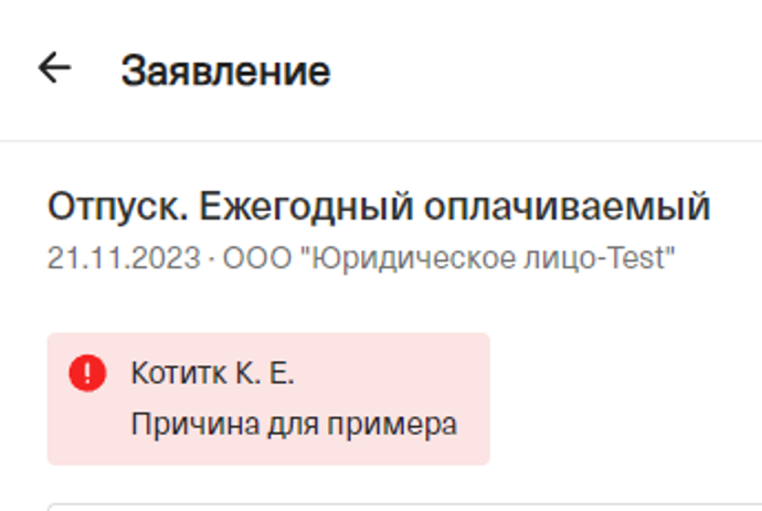 Штатный сотрудник, подавший заявление, также сможет ознакомиться с причиной отказа в приложении или веб-версии.